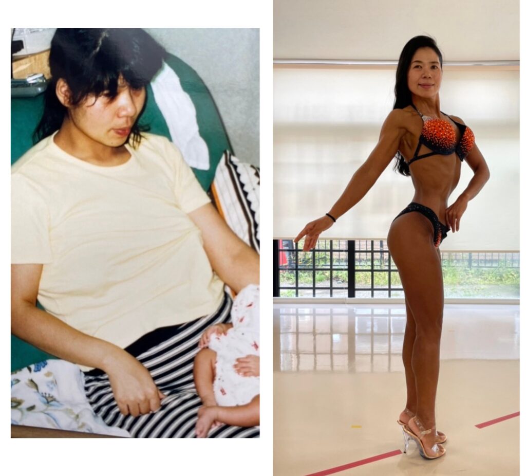 「どうせなら目標を持って」と決意し、ビキニフィットネスの大会へ。2019〜2022年に出場し、一度は全国大会にも進出。